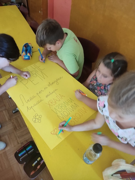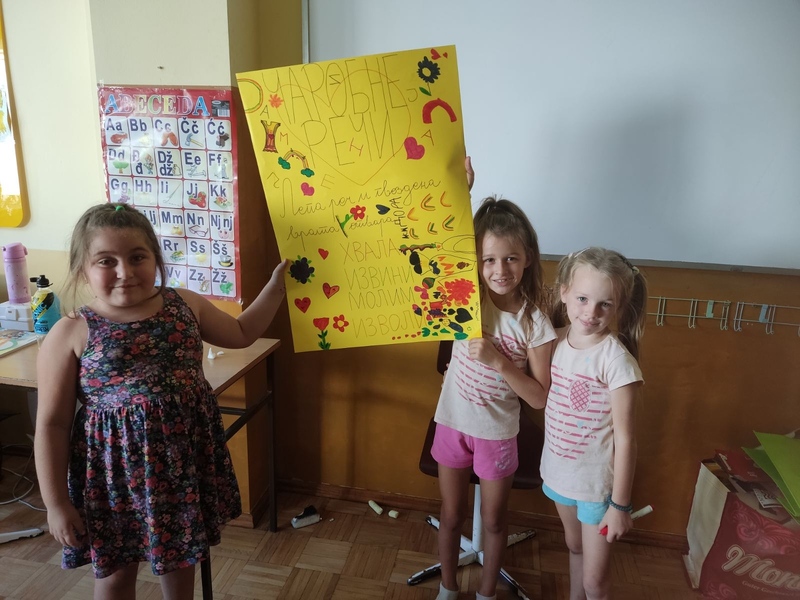 U okviru edukativne radionice ,,Lepa reč i gvozdena vrata otvara" učenici su pogledali kratak film pod naslovom: ,,Kocka, kocka, kockica- Lepa reč i gvozdena vrata otvara". Nakon čega su kroz razgovor sumirali svoje utiske i sve postavili na zajednički plakat.