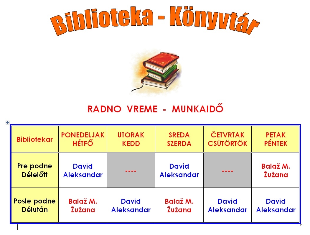 Školski bibliotekar vam stoji u svakom trenutku na raspolaganju. Takođe, možeš i od kuće putem interneta vršiti pretragu knjiga po naslovu, autoru, izdavaču, godini izdanja.