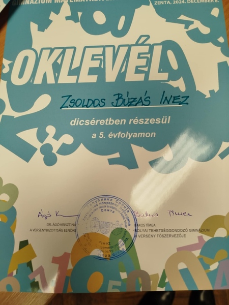 Dva učenika naše škole, Žoldoš Buzaš Inez (5.3) i Farkaš Mark (7.3), učestvovala su na 22. Memorijalnom takmičenju „Fekete Mihalj“ u senćanskoj Gimnaziji „Boljai“, koje predstavlja vojvođanski predselekcioni krug za Međunarodno mađarsko matematičko takmičenje. Na ovom prestižnom takmičenju naši učenici stekli su vredna iskustva i nezaboravne uspomene. Svaka čast svim takmičarima na njihovoj istrajnosti i zalaganju. Posebne čestitke upućujemo učenici Žoldoš Buzaš Inez, koja je za svoj uspeh osvojila pohvalnicu. Od srca čestitamo!