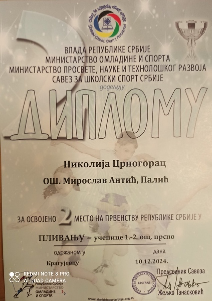Iz nase skole je ucestvovala ucenica 2 razreda Nikolija Crnogorac u disciplini prsno i osvojila 2 mesto sa vremenom 51.62