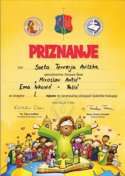 Na Vjeronaučnoj olimpijadi Subotičke biskupije održanoj 09.11.2024. u Totovom Selu u konkurenciji 108 učenika i 27 ekipa naša učenica Ema Ivković je kao aktivna članica Katedralne ekipe osvojila 1. mesto. Čestitamo!