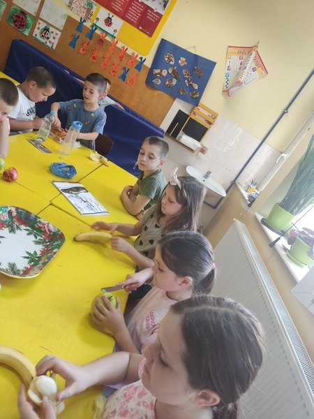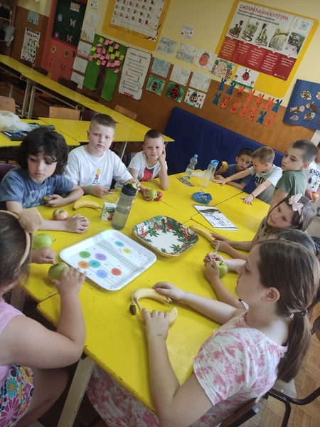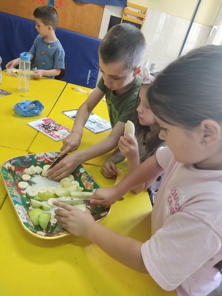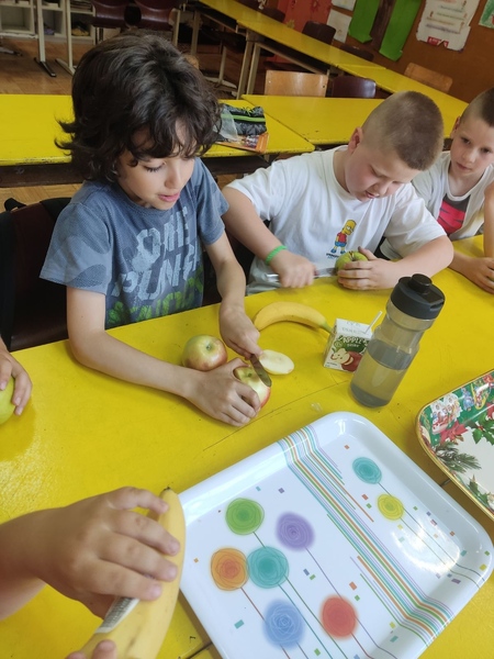 У оквиру продуженог боравка, ученици су правили воћну салату. Разговарали смо о врстама воћа, нашем омиљеном воћу и због чега је неопходно да га свакодневно уносимо у организам. Научили смо који витамини се налазе у воћу и за шта нам они служе. Затим су ученици уживали у радионици прављења воћне салате. Показали су своју машту и креативност.